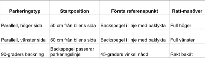 Tabellen nedan sammanfattar de viktigaste referenspunkterna och rattmanövrerna för parallellparkering och backning i olika situationer. Genom att använda backspegeln och baklyktan som visuella ledtrådar blir parkeringen enklare oavsett om du parkerar parallellt eller backar in i en rak parkeringsruta.