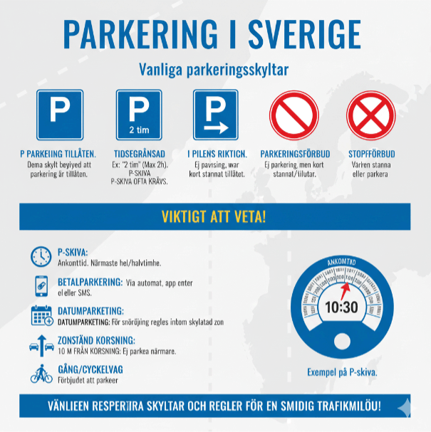 Utöver parkeringsteknik är det viktigt att förstå svenska parkeringsregler. P-skylten tillåter parkering, medan tidsbegränsade zoner kräver P-skiva inställd på närmaste halvtimme. Pilen visar parkeringsriktning, och röda förbudsskyltar markerar var parkering är förbjuden. Betalparkering sker via app eller automat, och kom ihåg att hålla minst 10 m avstånd från korsningar. Gång- och cykelvägar är alltid förbjudna för parkering – respektera detta för att undvika böter och bidra till en smidigare trafikmiljö.