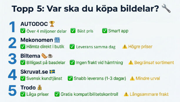 • Styrkan: Transparens och pris. Hemsidan uppskattas ofta för att vara ”ren” och lättnavigerad. De erbjuder en kostnadsfri manuell kompatibilitetskontrol (via registreringsnummer), vilket ger en extra trygghet för osäkra köpare. Prisbilden är aggressiv och lockar prismedvetna kunder.