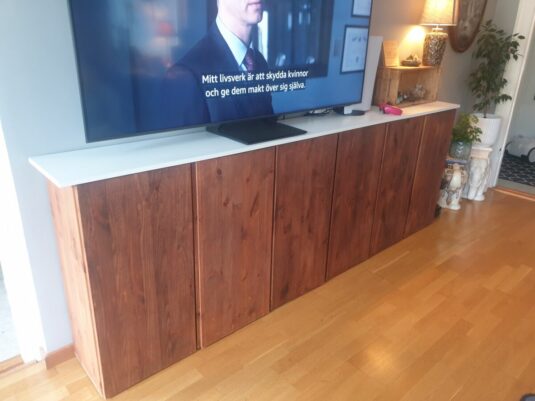 3st skåp i ”vintage ek” bets (inte på insidan) med en vit skiva som sticker ut 2 cm på vardera sida i fint skick.