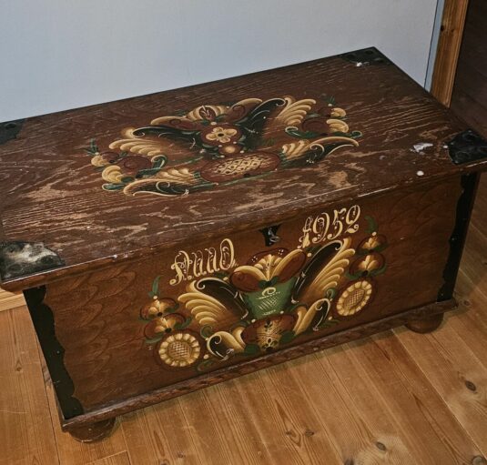 Kista i allmoge. Bredd 95 cm Djup 52 cm Höjd 52 cm. Slitet lock.