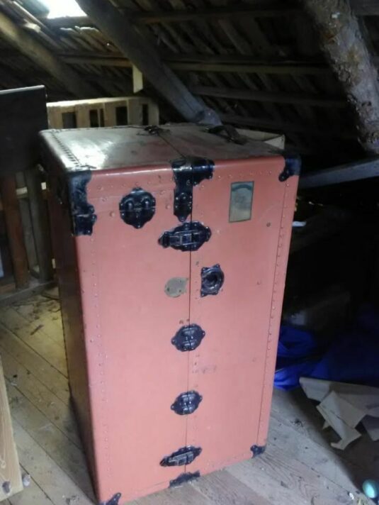 Gammal ”Amerikakoffert” eller resegarderob. Men kan öppna den stående och det finns lådor att dra ut och stång att hänga kläder på.