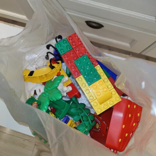 En påse med en blandning av två duploset + ett gäng med Duplo byggklossar.