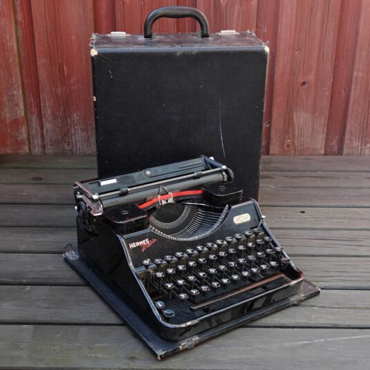 Inklusive väska. Från 40-talet. Inköpt på Carl Bergs kontorsmaskiner i Örebro. Väskan har slitage och några defekter så som saknad fot. Tillverkad i Schweiz. Finns i Lindesberg.