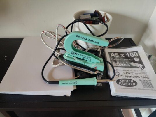 Ett kit med encaustic art. Smält vaxfärg och skapa konst. Både strykjärn och färger är välanvända men har fortfarande mycket att ge. Papper i A4 och A5 ingår.