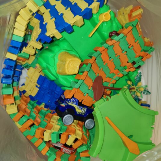 En flexirail bilbana med två bilar och en drakbro som ej syns på bild. Kan skicka via sms om så önskas. Tyvärr rullar inte bilarna som dem ska på egen hand, dem stannar i kurvor men det kanske går att lösa för den händige.