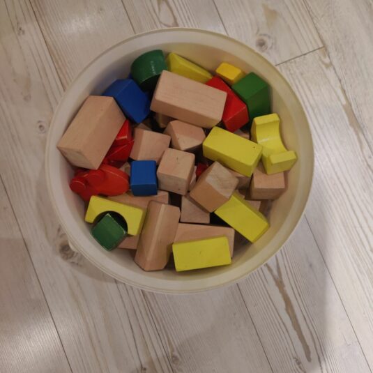 Träklossar i flera olika former! Majoriteten av dem är trä färgade. De färgglada ligger på toppen. Har legat på vind i ca 15 år. Dem var mycket älskade innan dess. Säljes till nästa liten (eller stor) som vill bygga vidare med dessa gamla godingar.