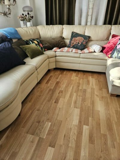 Skinnsoffa i gott skick, ljusbeige, inga slitskador.In köpt hos Jakobssons vid Odensbacken i Örebro. Gott om sittplatser och utrymme för bord i ’u-formen
