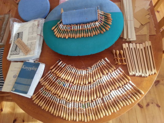 Välvårdad knyppeldyna med 150 spolar, 9 spolhållare , 60- tal hål korts mönster, litteratur. Armstödsbräda.