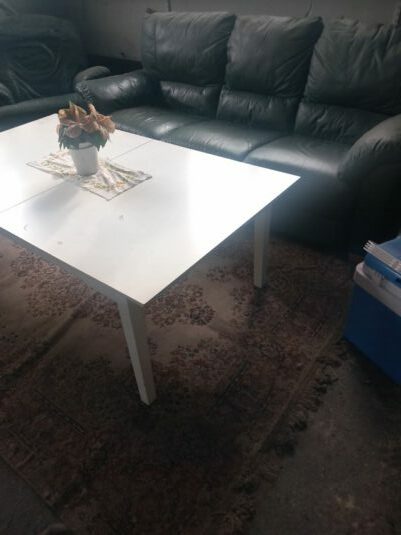 Skinnsoffa 3-sits med 2 fåtöljer och vitt soffbord säljes.