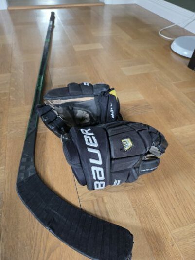 Sliten hockeyklubba + handskar skänkes