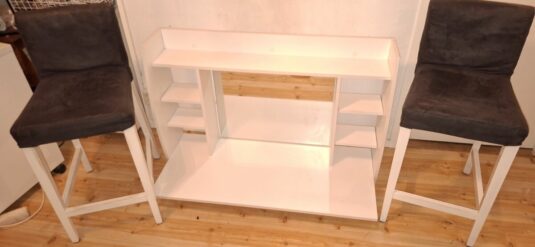 Vägghängt sminkbord med 2 barstolar säljes.