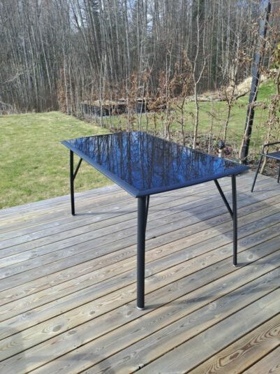 Säljer ett bord som går att ha ute eller i ett uterum. Aluminiumbord med glasskiva