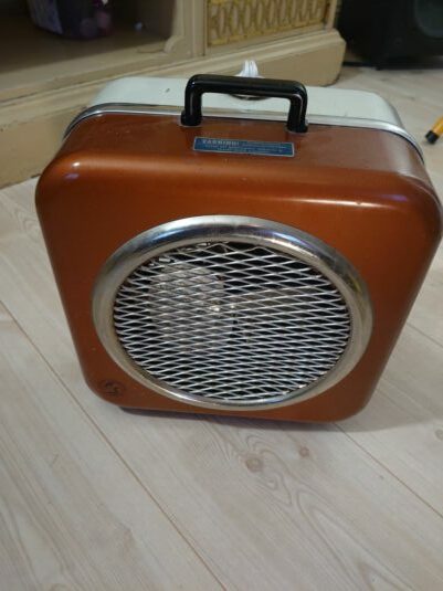 Värmefläkt ”elektrovind”. Tillverkad av ”Elektro standard Katrineholm” Fungerar bra. Medföljer ingen sladd. Ska vara en gammal ojordad som fanns på gamla våffeljärn. Mått: 32×29, höjd 32 cm.
