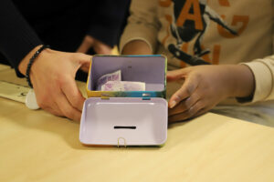 Tillsammans har eleverna pantat returflaskor och burkar, och pengarna har man lagt i en liten skattkista. Pedagogen Mia öppnar den och redovisar hur mycket man fått in hittills.