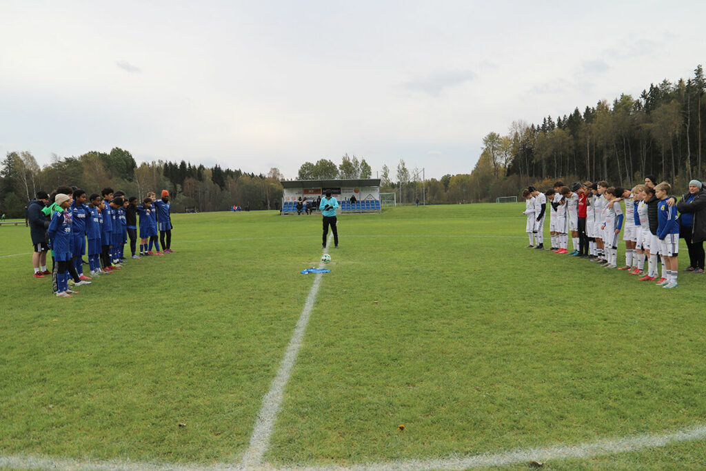 Klockan slår 09.00 och det är dags för första matchstart, på samtliga planer ställer de mötande lagen upp sig vid mittlinjen, lägger armarna om varandra och inväntar domarens signal, som just den här gången betyder att man startar en tyst minut. Domaren fattar visselpipan och blåser, och hela Fritidsbyn tystnar. I mittcirkeln på plan A ligger Benjamins matchtröja, som bär nummer 10, utlagd för att hedra hans minne. Efter en minut blåser domare Islamdin Abulkhariyev igång matchen, och cupen är igång på riktigt.