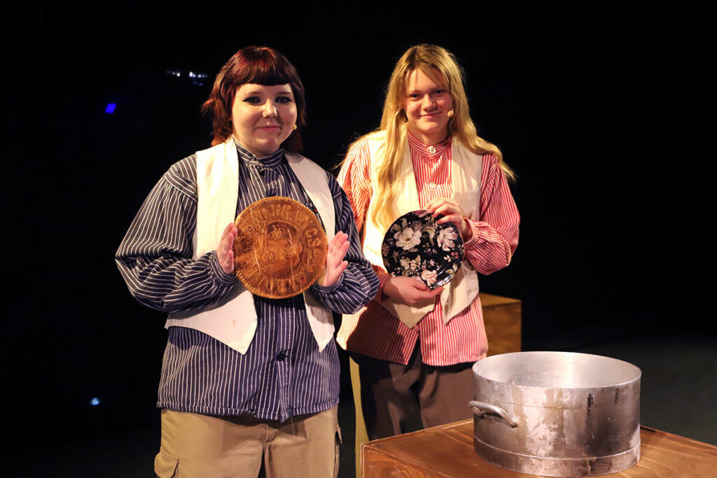 Irma Vallgren och Lowa Arvidsson visar upp musikalens omtalade tallrikar. Foto: Jennie Einarsson