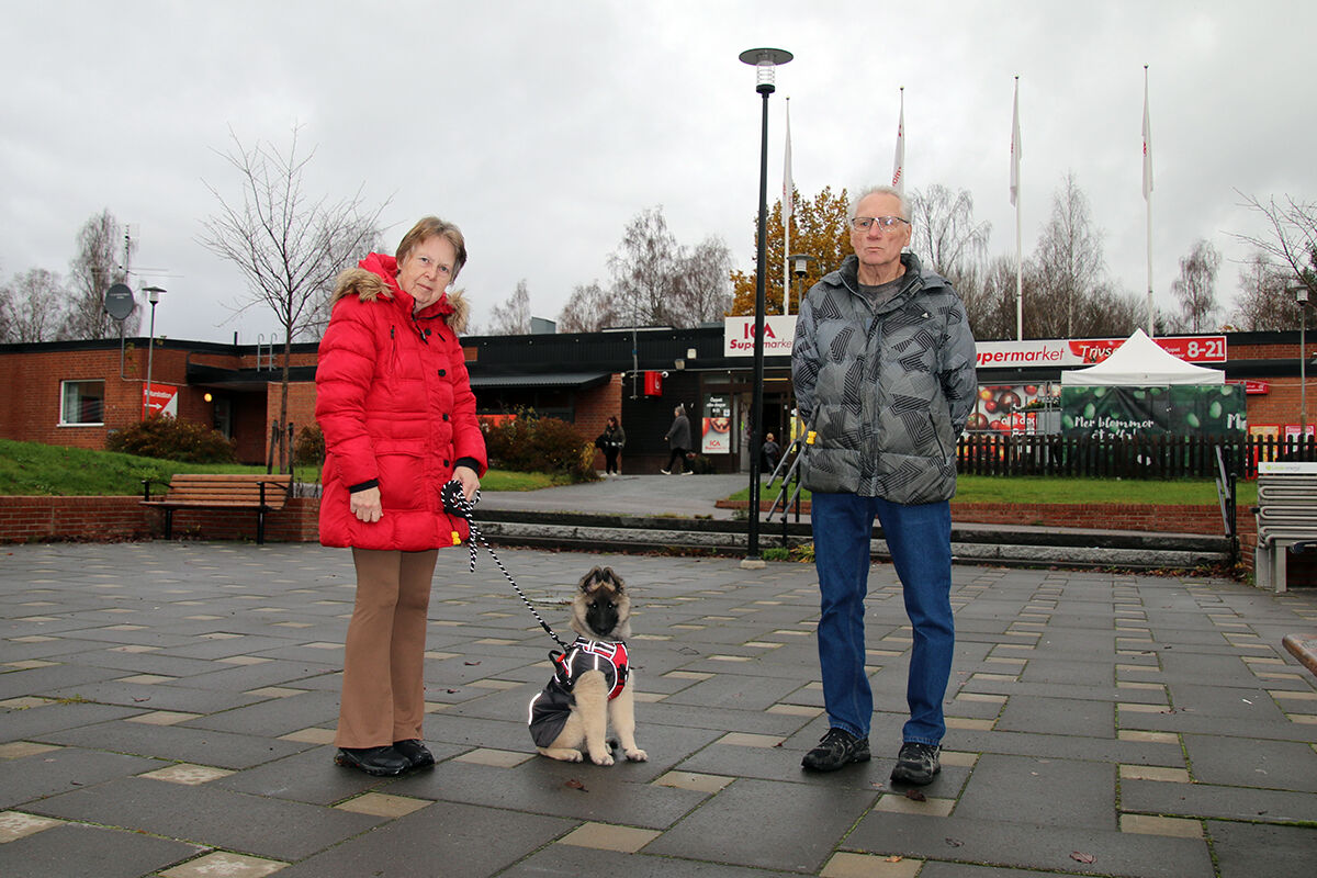 Berit och Börje Larsson går en promenad förbi bruket med sin lilla valp Leo. Även de är märkbart upprörda över det som sker just nu.