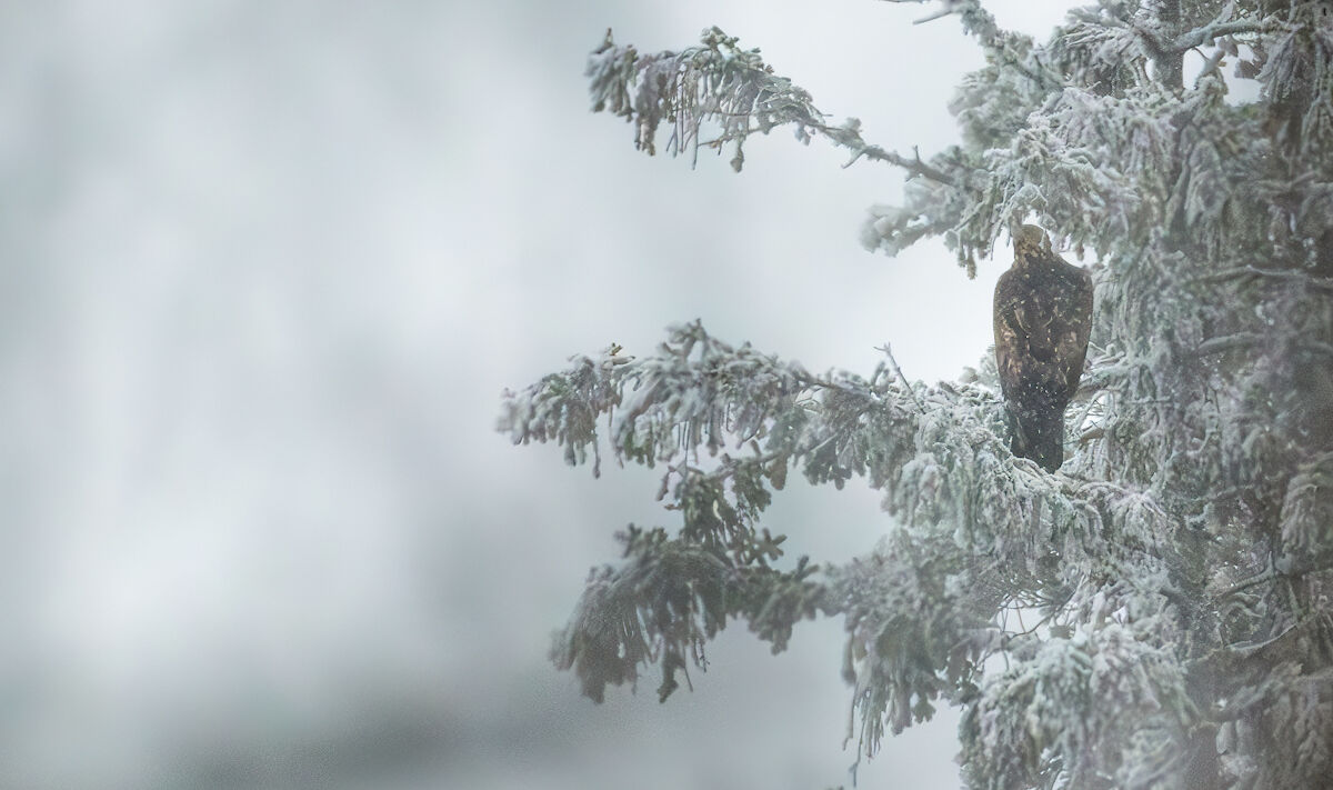 Några sekunder senare så flög den ner från trädet mot ett tätare skogsområde. Detta är inte min bästa bild på den mäktiga kungsörnen jag lyckats fånga, men jag gillar känslan i bilden då den visar hur det oftast ser ut för oss naturfotografer. Det är sällan vi har perfekt förutsättningar för att lyckas ta den där perfekta bilden. /Sami