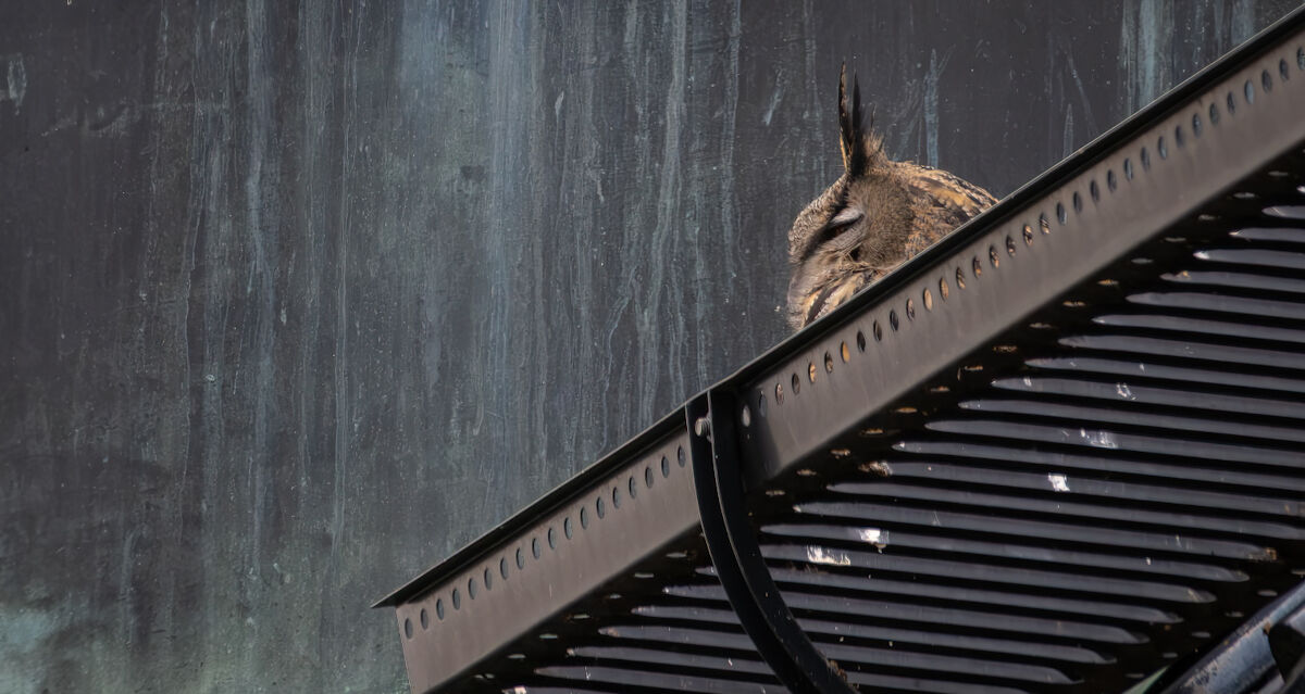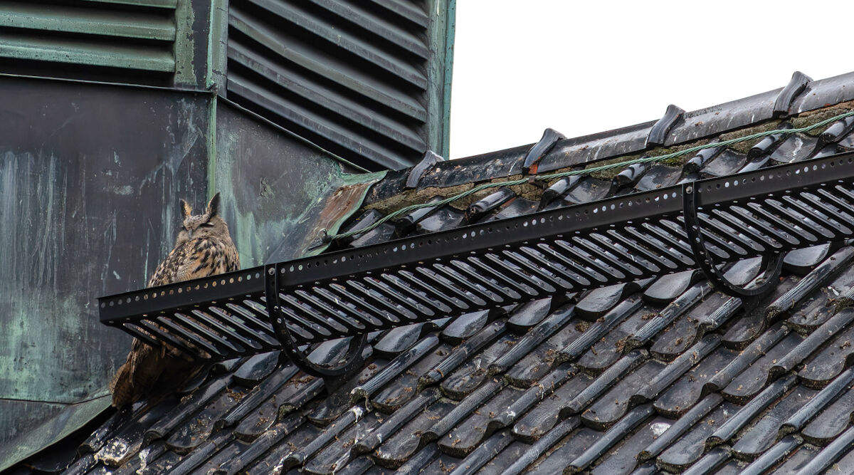 Sedan hände något som var väldigt trevligt. En man kom fram till mig och bjöd upp mig till ett av de torn som finns uppe på taket där berguven satt. Först trodde jag han skämtade med mig, men det visade sig att han jobbade i samma byggnad och hade tillgång till ett utrymme som skulle ge mig första parkett.