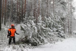 Med van hand sågar Albin Myhrén ner de sista granarna, innan han och Verona Andersson bär bort dem ett bit för senare transport. För att granarna sedan ska stå stadigt inne i arenan har kommunens arbetsmarknadsenhet byggt fötter till dessa.