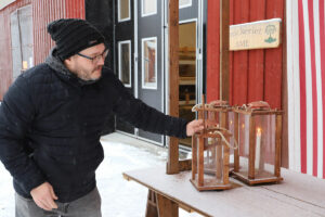 Tobias Skogdalen visar lyktornas konstruktion. Foto: Camilla Lagerman