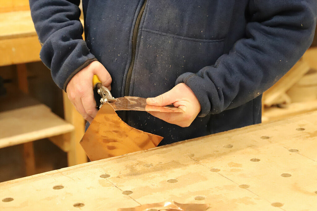 Andreas Jakobsson klipper plåt till lyktorna. Foto: Camilla Lagerman