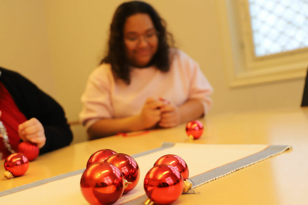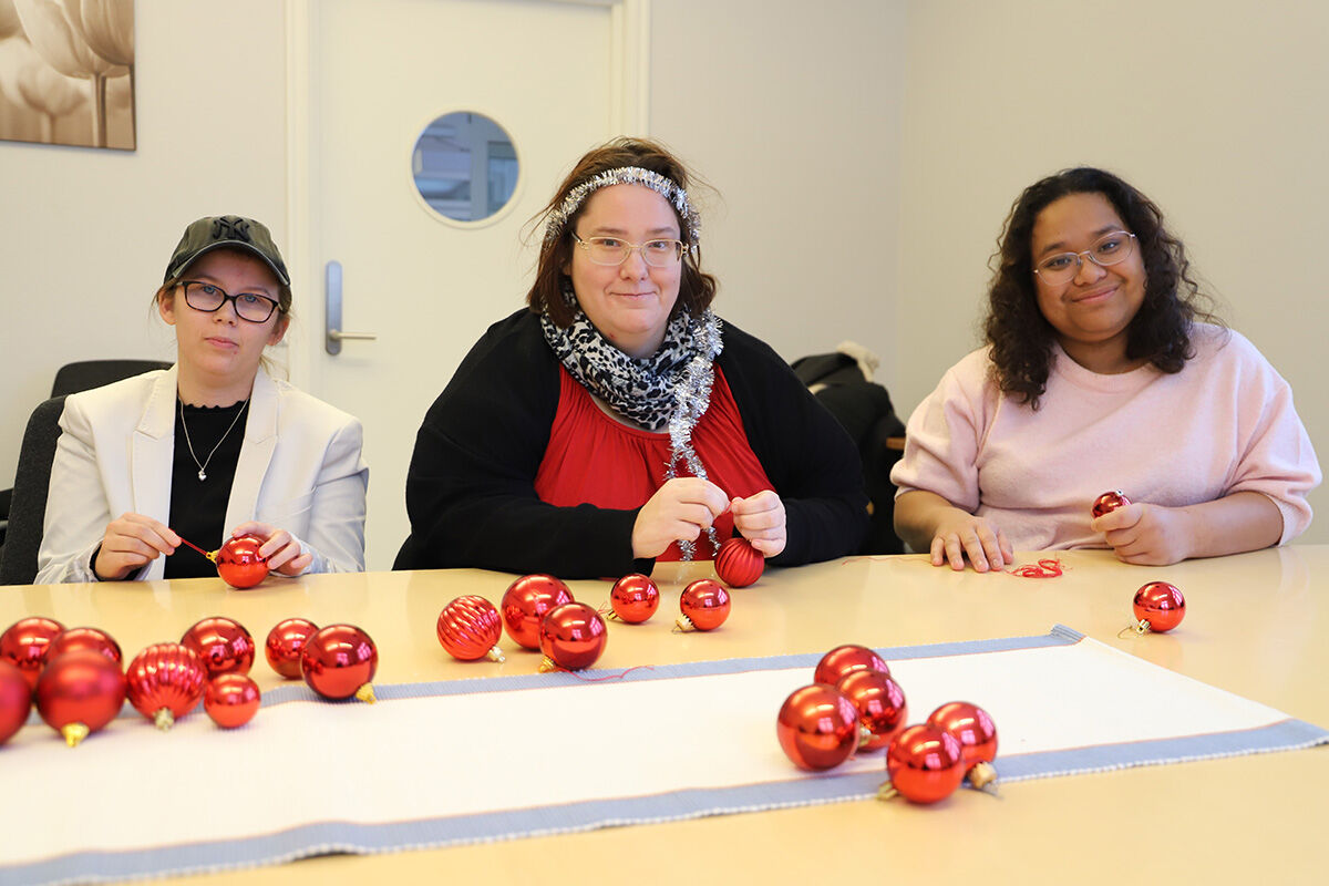 För att de 2000 julkulorna ska kunna hänga bra i granarna, har deltagare från kommunens daglig verksamhet försett dessa med röda snören, ett arbete man är i slutfasen med.