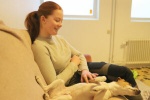 Tova Berg arbetar heltid på dagiset. Här med den nya dagisvalpen Wiggo. Foto: Camilla Lagerman