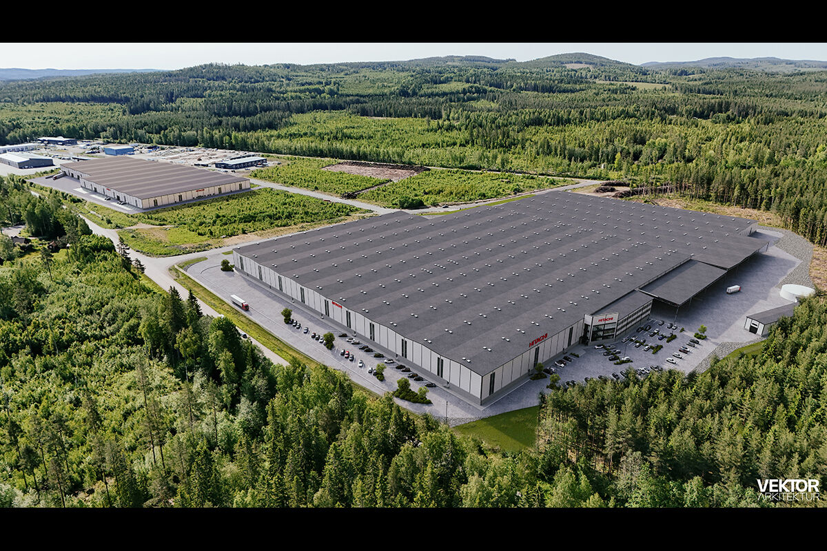 Visualisering av Hitachis nya lagerbyggnad i Ludvika. Bild: Vektor Arkitektur