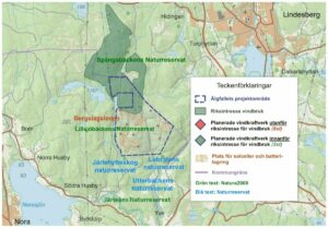 Det har aldrig någonsin byggts så höga vindkaftverk i Sverige som planeras vid Älgfallet (placerat mitt emellan Nora och Lindesberg). Det handlar om 11 st vindkraftsverk som planeras bli upp till 300 meter höga, vilket är nästan lika högt som Eiffeltornet (312 meter). Hela projektområdet är ca 550ha (5,5 kvadratkilometer). Det handlar också om stora ytor med solceller och batterilagring. Batterierna vet vi väldigt lite om än, de beskrivs som stora som fraktcontainrar i samrådsunderlaget, men det framgår inte hur många som planeras. Läs mer om projektet Älgfallet