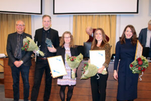 Frank Tholfsson, kulturnämndens orförande, kulturprisvinnaren Michael Horvath Dahlman, samt de tre kulturstipendiaterna: Monika Ragnarsson, Malin Dahl och Maria Simonsson Thulin. Foto: Jennie Einarsson