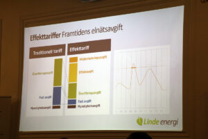 – När de nya effekttarifferna införs vill vi i dialog med er kunder titta på möjligheter. Vår tanke är att hantera detta med kommunikation och rådgivning. Här finns mycket att jobba med i det egna hemmet. Batterier har varit på tal. Det finns idéer om att se över hur vi skulle kunna erbjuda batterier till det egna hemmet för att slippa effekttopparna. Vi har tuffa fajter med regionnätsbolagen som är över oss och som vill öka taxa och tariff mot oss. Vi är närmast er och vår uppgift är att försöka trycka tillbaka och vara innovativa, avslutade Joakim innan han lämnade över ordet.