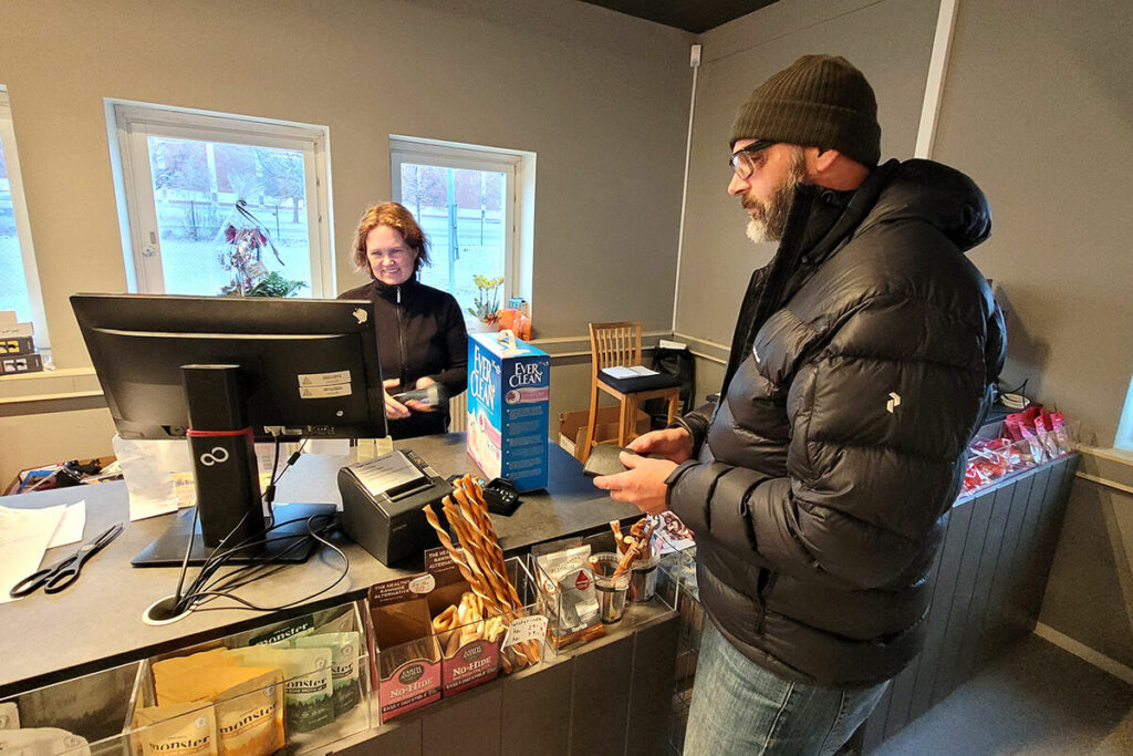 Charlotte hjälper en kund i nya kassan. Foto: Jennie Einarsson