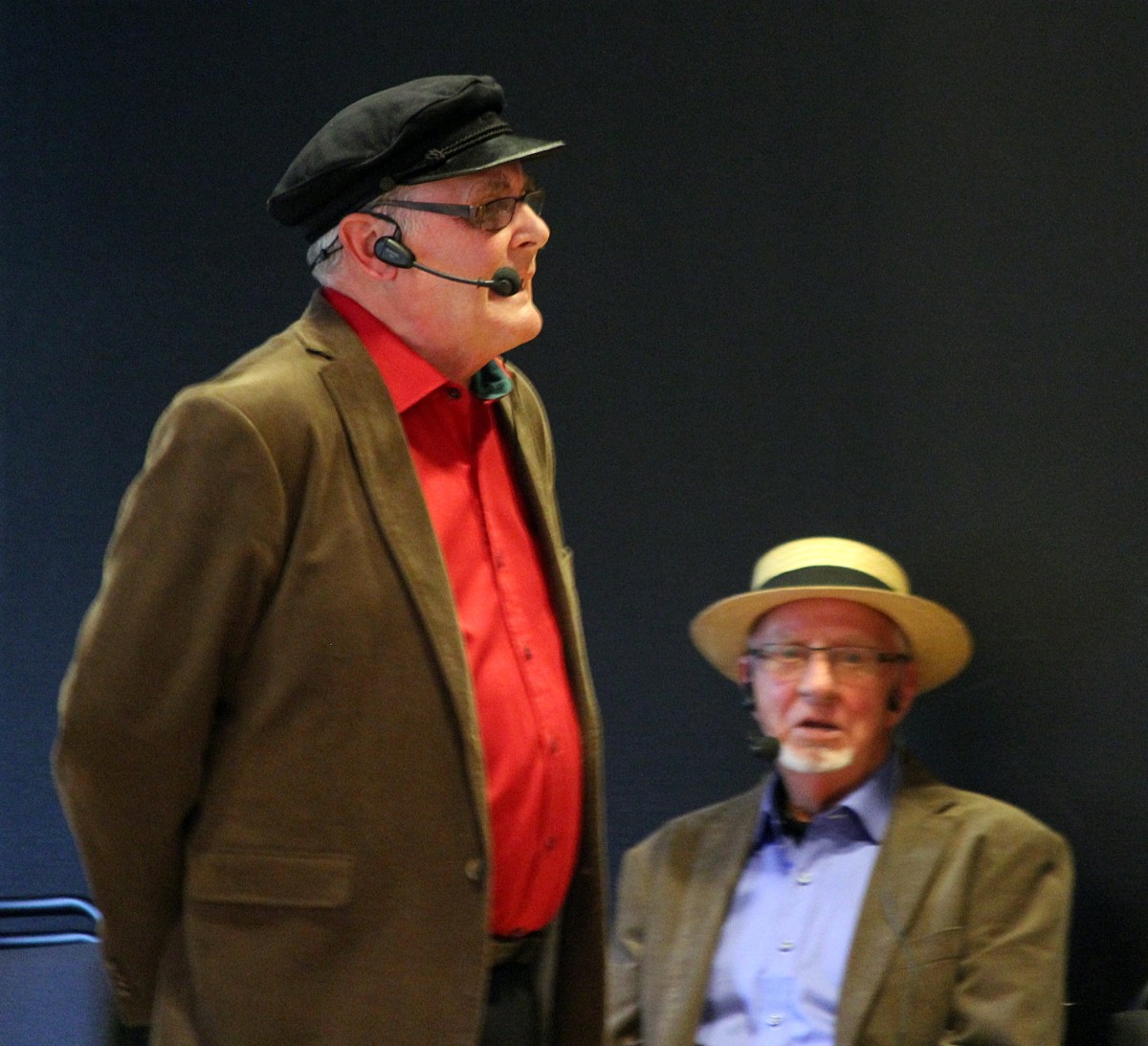 ”Tre gökar” består av Sten-Åke Björnstedt, musiker och revyspelare, Leif ”Tjappe” Gustafsson, har varit elitdomare i bandy men började intressera sig för teater för drygt 15 år sedan, och så Ola Johansson som är en hejare på trumpet och också engagerad i revy. När ”Vilda Hildas Revy” uppstod kom de alla tre att medverka och på den vägen har det blivit. I vanliga fall håller de sig mestadels inom Östergötland, men har idag har de rest iväg från Motala för att underhålla vid SPF Seniorerna Lindesbergs månadsmöte. Den pensionerade skaran träffas den tredje onsdagen i varje månad, och man dricker kaffe, samtalar, går igenom mötets olika punkter och lite underhållning sitter ju heller sällan fel. Långborden är framställda och uppdukade i församlingshemmet, och det börjar bli tid att dra igång för dagen.