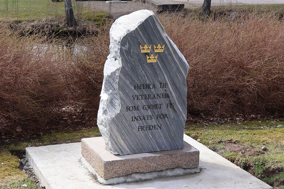 Inskriptionen lyder: ”Hedra de veteraner som gjort en insats för freden”. Denna text har veteranerna i Lindesberg varit delaktiga i att utforma.