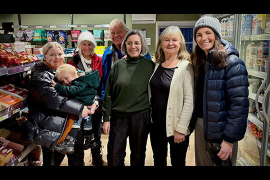 Lisa Blomkvist med sonen Eyvind, Gunvor Persson, L-G Persson, Anna-Carin Björkman, Mimmi Lagerman och Mirjam Björkman är några av eldsjälvarna som driver Ramsbergs Handel. Foto: Privat